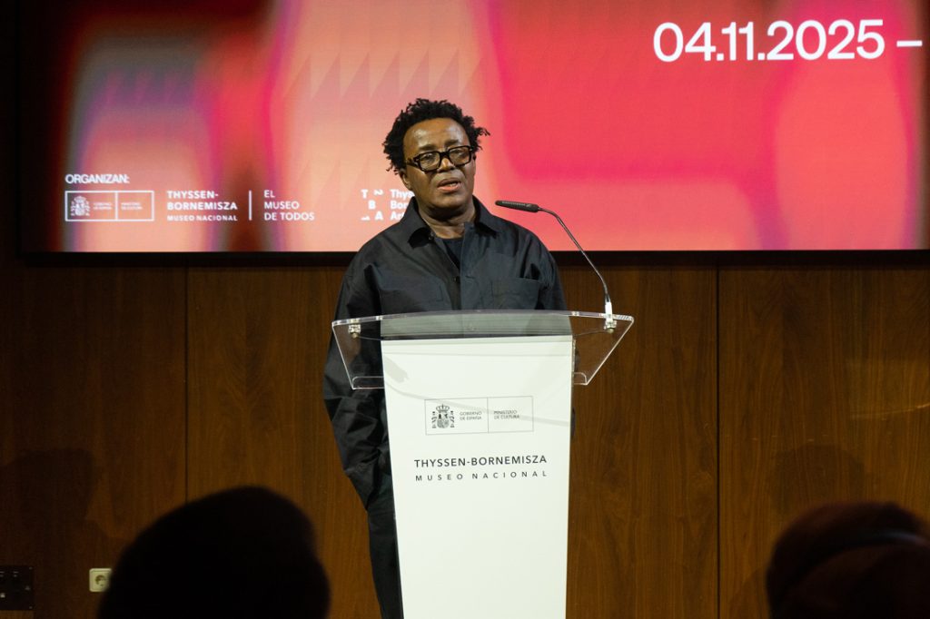 John Akomfrah durante la presentación de la obra en el auditorio del Museo Thyssen. Fotografía: Javier Sánchez Salcedo