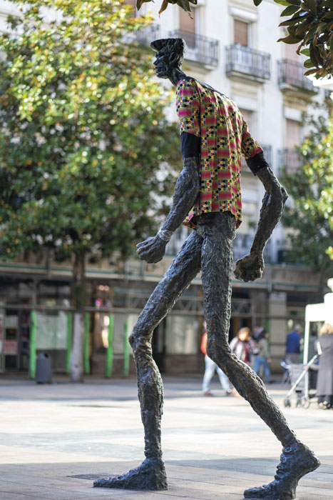 «El caminante» de Vitoria-Gasteiz, vestido con una camisa camerunesa confeccionada con ocasión del IV Festival Afrikaldia. Fotografía: Gonzalo Vitón / MN