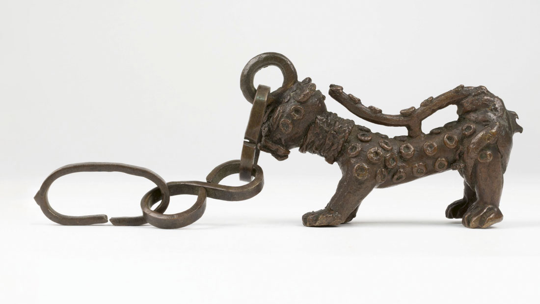 En la imagen superior, una de las piezas que el MAA devolverá a Nigeria: un leopardo de latón con manchas en relieve, sujeto por la cabeza a una cadena. Fotografía: MAA / Universidad de Cambridge.